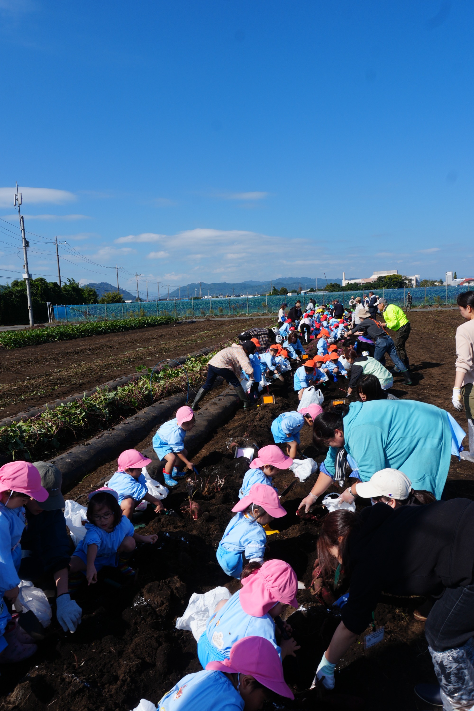 秋晴れの空の下、全園児で楽しみにしていたお芋堀りに行ってきました。掘りはじめは「固いよー」と苦戦していた子ども達でしたが、土の中からさつまいもの頭が見えはじめると、みんなの目がキラキラと輝いていました。掘り出したお芋を持ち、「先生見て!大きいのがとれたよ!」とあちこちから嬉しそうな歓声が上がりました。子ども達は、秋の恵みと土の感触を楽しんでいました。秋の実りに感謝し、収穫の喜びを味わうことができた一日となりました。