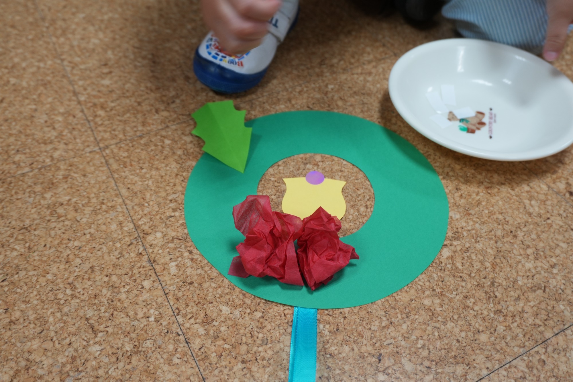 25日、「1・2歳児親子で遊ぼう」の活動で、クリスマスのリースづくりを楽しみました。
