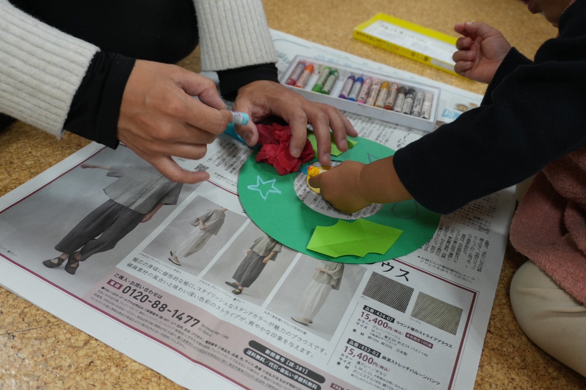 リースづくりでは、"まるいリースの土台に、みどりの葉っぱをペタッ" "赤い実をつけて、クレヨンでぐるぐるお絵かき”